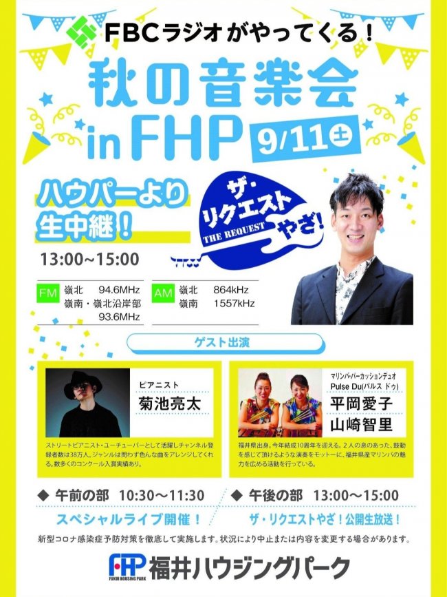 9月11日(土)13:00~15:00 毎週土曜放送の「ザ・リクエストやざ!」をハウパーから生中継。ゲストにピアニストの菊池亮太さんと、マリンバ・パーカッションデュオ Pulse Du(パルス ドゥ)の平岡愛子さん、山崎智里さんのお二人を迎えスペシャルライブを開催。