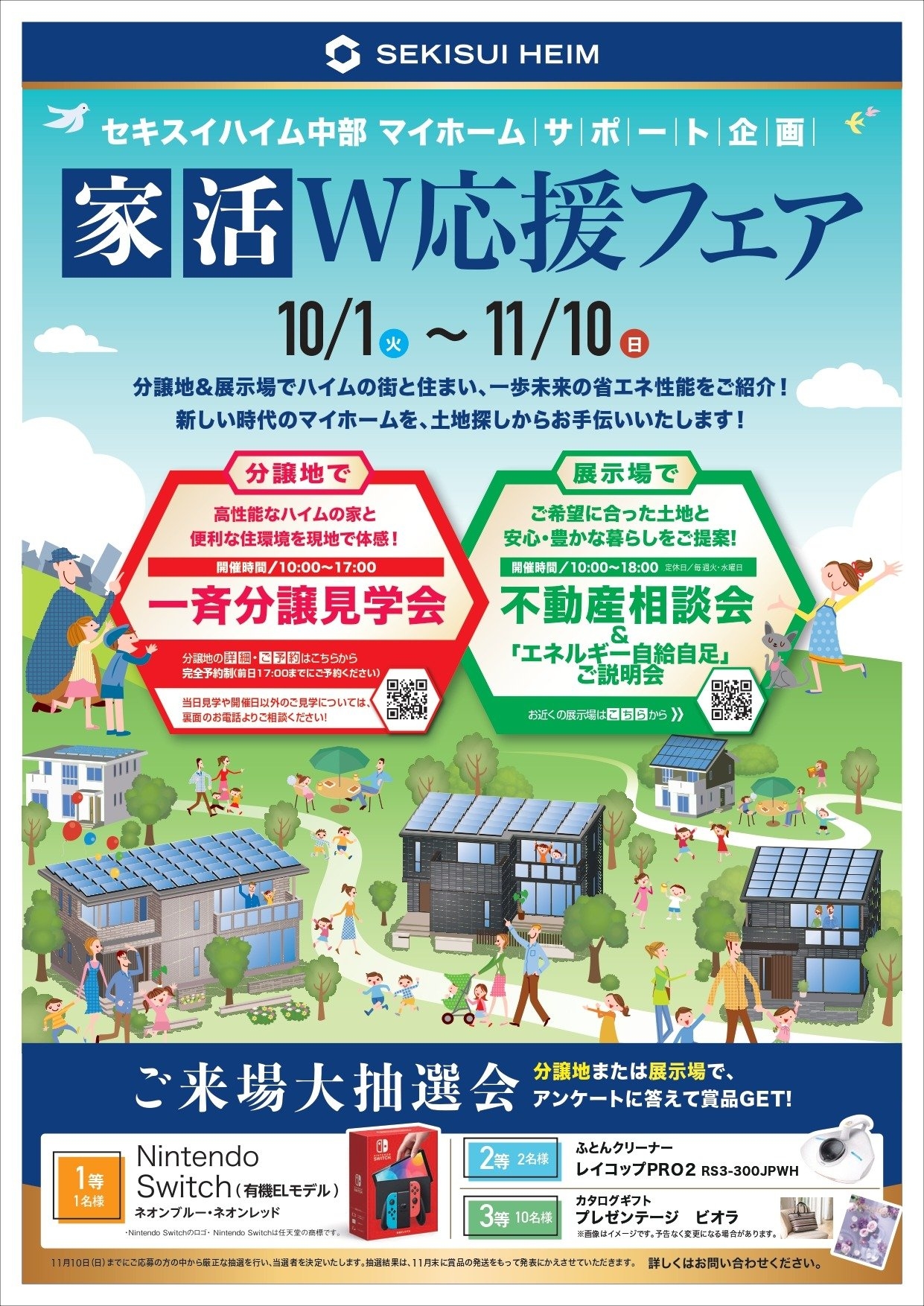 10/1(火)より、セキスイハイム展示場および分譲地にてマイホームサポート企画として家活W応援フェアを開催致します!
