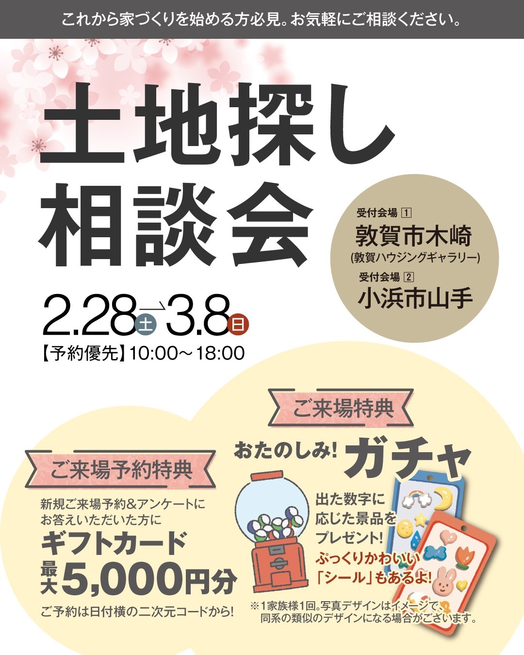 敦賀市木崎/小浜市山手にて土地探し相談会を開催いたします。
