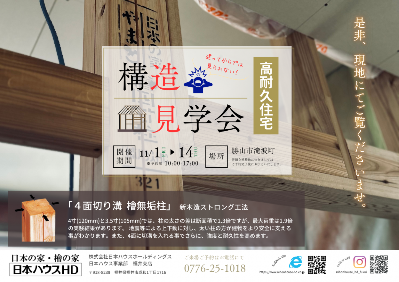 施主様のご厚意により、勝山市にて構造見学会を開催させていただきます。