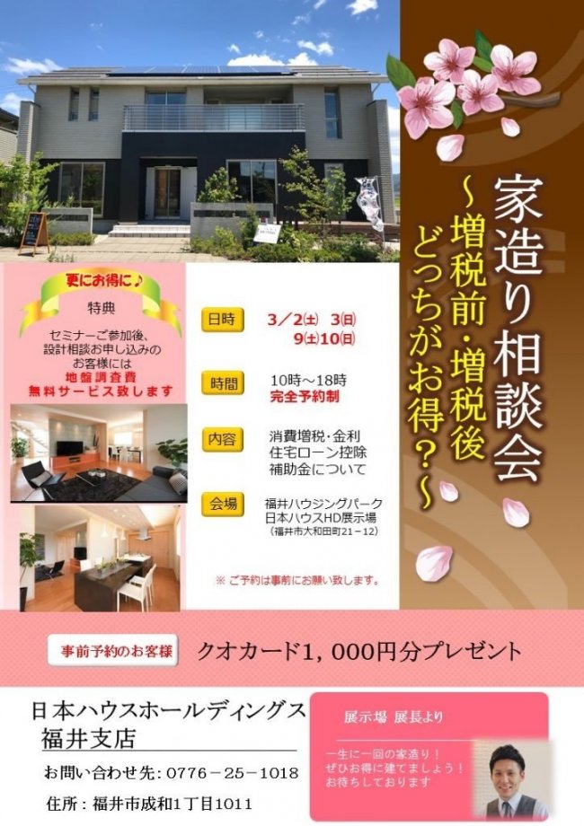 3月は、気になる増税について、詳しくなって頂ける「家造り相談会」を開催します!