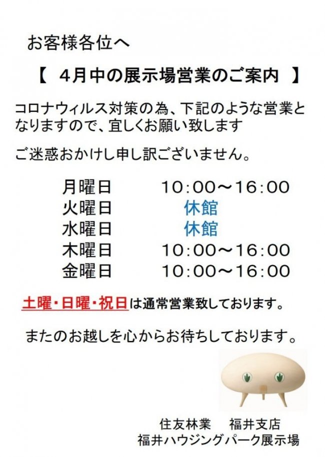 平日営業時間の縮小ならびに火曜・水曜は休館させていただきます。