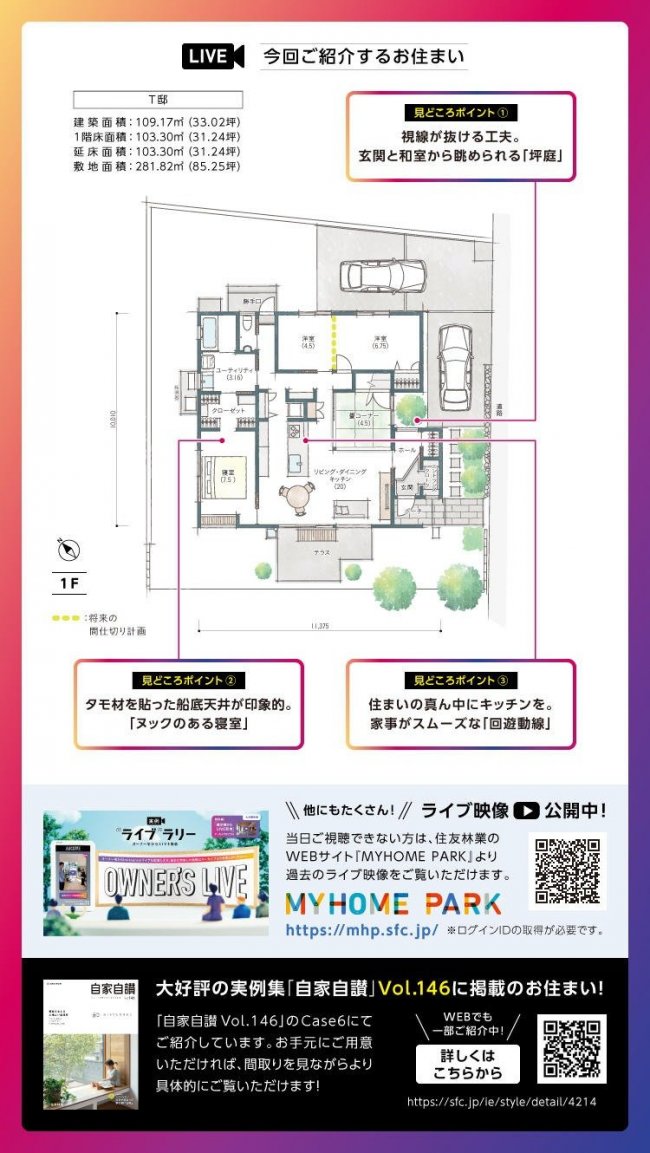 船底天井の寝室や、視線を導く坪庭、回遊動線による家事のスムーズさも